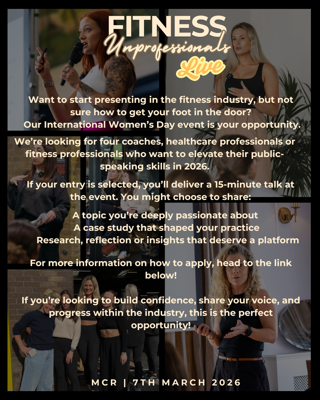 Whether you'd like to upskill in the latest hot topics, meet new coaches or even present yourself - the Fitness Unprofessionals Live event in Manchester has you covered.